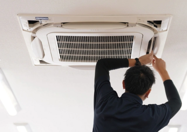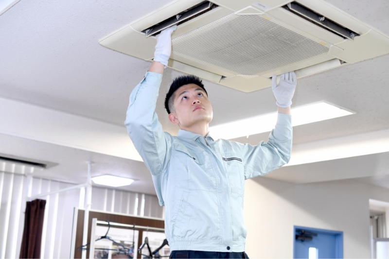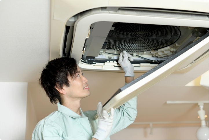 一般的なオフィスや店舗の場合、年に1~2回のクリーニングを推奨しています。飲食店や工場など、油汚れやホコリが多く発生する環境では、